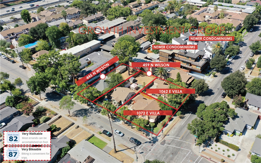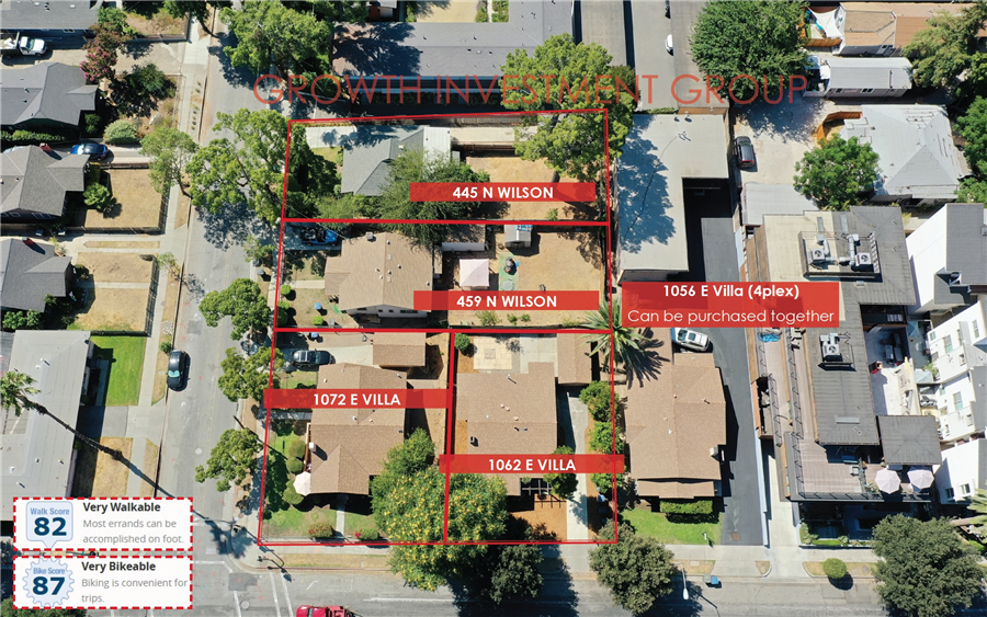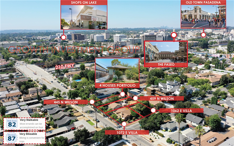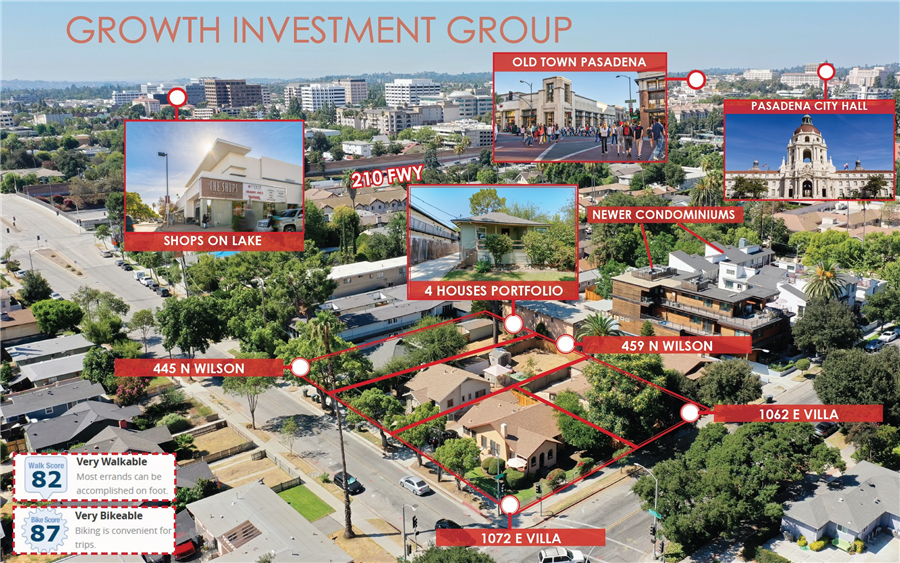 Growth Investment Group California is proud to offer a four single family houses portfolio in a highly desirable location in the City of Pasadena, CA. The portfolio consists of 4 SFRs located at: 445 N Wilson Ave (vacant), 459 N Wilson Ave (tenant occupied), 1072 E Villa St (corner – tenant occupied), and 1062 E Villa St (vacant). These 4 SFRs have been very well maintained by current family who have owned it since 1961, 1981, 1983, and 1988. The properties are in a highly gentrified area right across from a 22-unit condominiums project and only a lot away from 2 newer condominiums projects. It is located only 3 blocks east of Lake Ave, and minutes away from most of City of Pasadena amenities such as Old Town Pasadena, Lake Ave Shopping District, Rose Bowl area, CALTECH and PCC. It is surrounded by other small apartments and single-family houses and has excellent demographics of ±$120,347 average household income in a 1-mile radius.